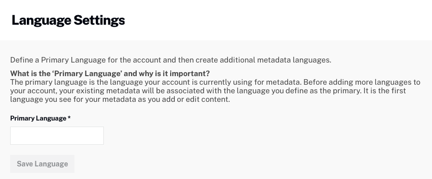 [言語設定] では、第一言語を定義し、追加のメタデータ言語を追加および管理します。第一言語は、アカウントが現在動画のメタデータに使用している言語です。アカウントに言語を追加する前の、既存のメタデータは、第一言語として定義した言語に関連付けられます。第一言語は、Media モジュールでビデオプロパティを編集するときに最初に表示される言語です。