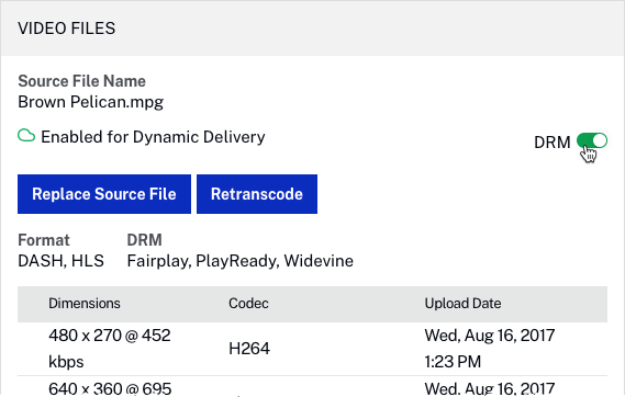 動画の DRM パッケージングのデフォルトを設定するには、ブライトコーブサポートにお問い合わせください。取り込みプロファイルで DRM パッケージを指定する必要はありません。アカウントで DRM が有効で、DRM なしで一部のタイトルを配信する場合は、メディアモジュールでビデオのプロパティを編集し、ビデオの DRM フラグを「DRM なし」に設定します。