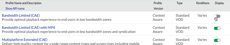 取り込みプロファイルには、を使用して動画をアップロードするときに使用されるトランスコード設定が含まれていますモジュールのアップロードまたは動的取り込みAPI。表示される取り込みプロファイルエディターは、アカウントに設定されているトランスコーディングオプションに基づいて変更されます。