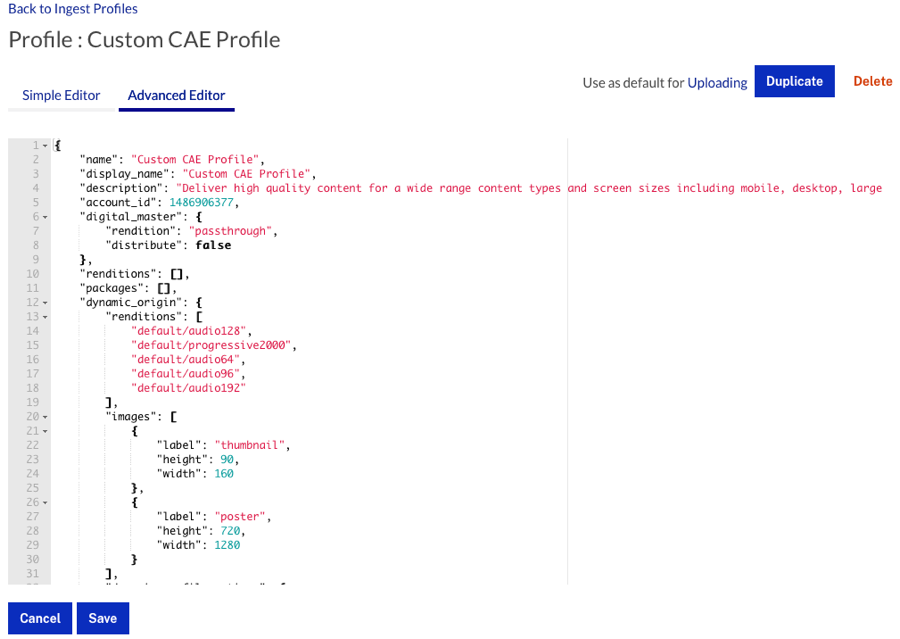 JSON はここで編集できますが、ブライトコーブでは Simple Editor を使用してプロファイルを編集し、間違いの可能性を減らすことを推奨しています。使用可能な属性については、「動的配信およびコンテキスト対応エンコーディングの取り込みプロファイル API フィールドリファレンス」を参照してください。