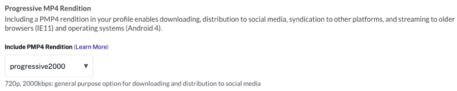 - 作成するプログレッシブ MP4 レンディションを選択します。Social モジュールを使用してソーシャルメディアアカウントに動画を投稿したり、動画のダウンロードを許可したりするには、少なくとも 1 つの MP4 レンディションが必要です。選択するなし MP4レンディションを作成しない場合。