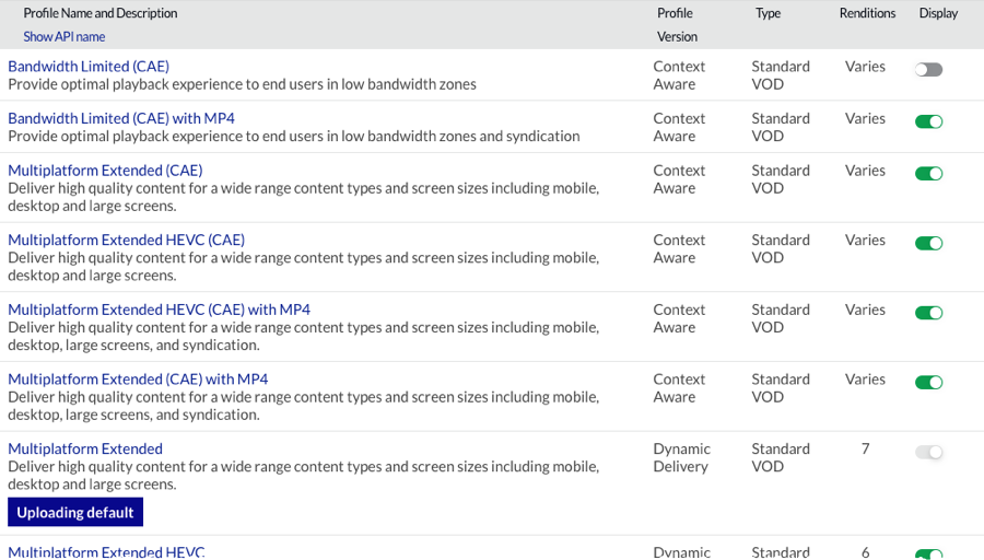 Video Cloud アカウントには、1 つ以上のトランスコーディングオプションが設定されます。すべての Video Cloud アカウントは、編集または削除できない初期設定の取り込みプロファイルで設定されています。これらはでマークされていますタイプの標準VODスタジオで。プロファイルバージョンには、プロファイルで使用されるトランスコーディングのタイプが表示されます。ブライトコーブが提供するインジェストプロファイルで提供されるレンディションの詳細については、該当するドキュメントを参照してください。