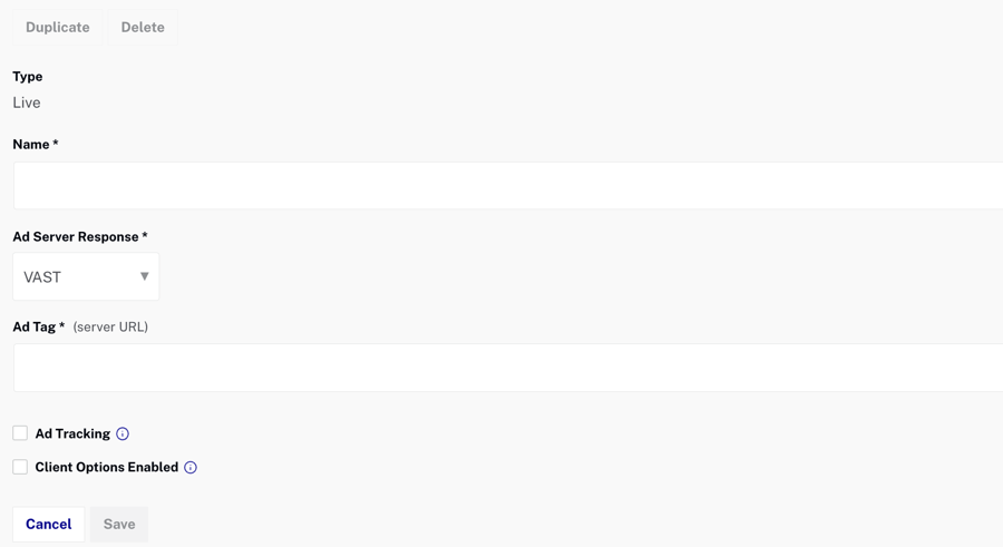 サーバーサイド広告設定ページでは、ライブおよび VOD の広告構成を管理します。なお、サーバーサイド広告設定ページにアクセスするには、管理者権限を持つユーザーである必要があります。