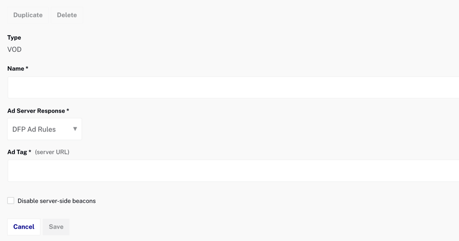 - サーバーサイドビーコンを無効化 にチェックを入れると、サーバーサイドでのビーコン発火が無効になり、すべてのビーコンは VMAP 出力に含まれます。