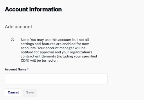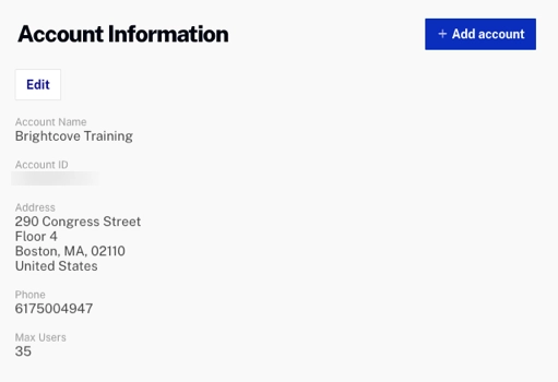 アカウントでクローン作成機能が有効になっている場合、アカウントの追加 ボタンが表示されます。アカウントのクローン作成機能を使用すると、新しいアカウントを作成できます。新しいアカウントが作成されると、Brightcove サポートに通知され、その後弊社営業と連携して(契約に基づいて)新しいアカウントの確認を行います。確認後、契約で定義された機能が新しいアカウントに設定されます。設定が完了すると通知が届きます。設定作業中でも新しいユーザーをアカウントに追加することが可能です。