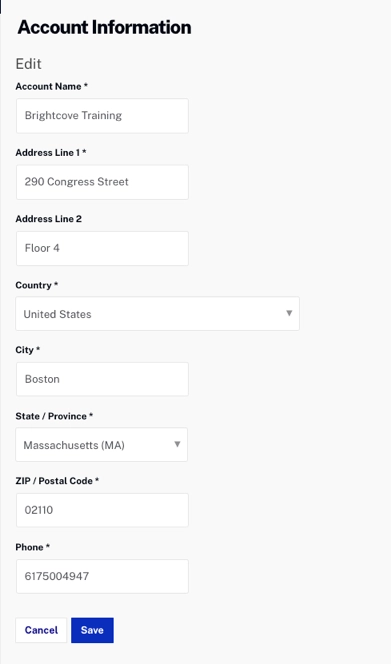 アカウント情報ページでは、アカウント名や郵送番号、住所の管理、およびアカウントのクローン作成が行えます。なお、アカウント管理ページへアクセスするには、管理者ロールを持つユーザーである必要があります。