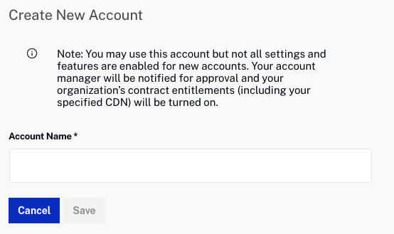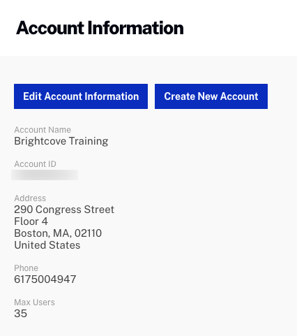 アカウントでアカウントのクローン作成が有効になっている場合は、[ 新しいアカウントを作成 ] ボタンが表示されます。アカウントのクローン作成機能を使用して、新しい Video Cloud アカウントを作成できます。新しいアカウントが作成されると、Brightcove サポートに通知が届き、アカウントマネージャーと協力して (契約に基づいて) 新しいアカウントを確認します。確認後、アカウントは契約書に記載された機能を使用して設定されます。アカウントが完全に構成されると、通知されます。設定の進行中は、新しいユーザーをアカウントに追加できます。