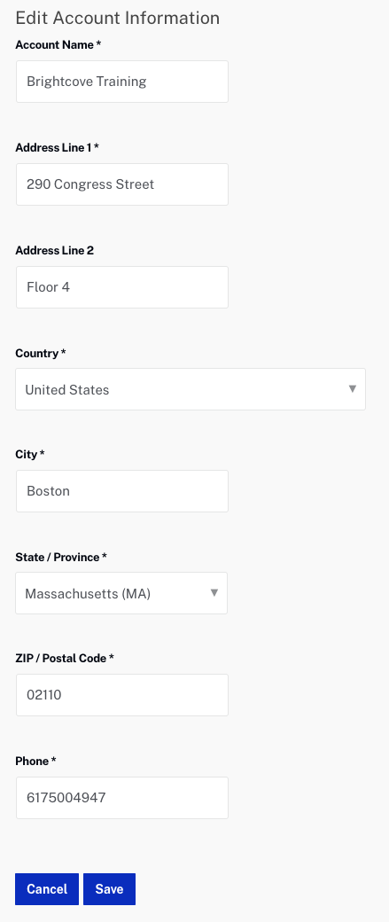[アカウント情報] ページでは、アカウント名と郵送先住所を管理し、アカウントの複製に使用できます。「アカウント管理」ページにアクセスするには、管理者ロールを持つユーザーである必要があります。