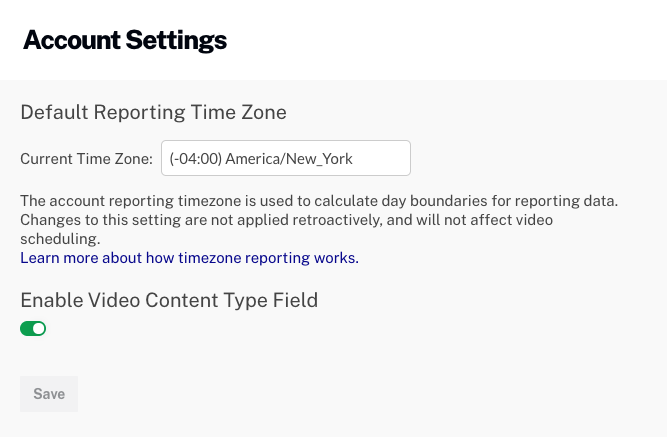 もしもビデオコンテンツタイプフィールドを有効にするを有効にすると、[ビデオコンテンツタイプ]フィールドがメディアモジュールのホームページに表示されます。また、ビデオプロパティページでビデオコンテンツタイプをビデオに割り当てることもできます。ユーザー管理の詳細については、を参照してください。ビデオコンテンツタイプの概要。