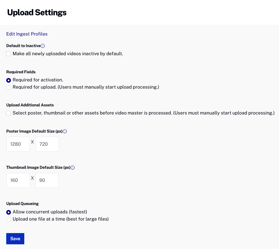 デフォルトの画像サイズ -これらの値を使用して、ポスターおよびサムネイル画像のデフォルトの画像サイズを設定できます。アップロード設定の一部としてサイズを設定することで、取り込みプロファイルで画像サイズを設定する必要がなくなります。これらの値が構成され、取り込みプロファイルに画像サイズも設定されている場合、Video Cloud は次のプロセスを使用して、さまざまなタイプの画像取り込みに使用する寸法を決定します。