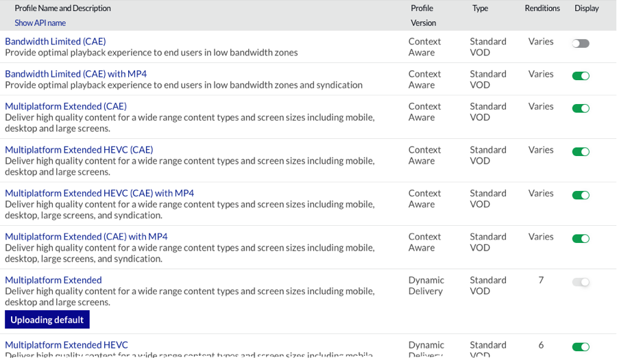 - 標準 VOD -これは Video Cloud によって提供されるデフォルトのプロファイルであることを示します。このタイプのプロファイルは、編集または削除できません。