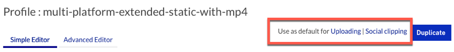 デフォルトの取り込みプロファイルは、Social モジュールを使用して動画がアップロードされる時とクリッピング時に設定できます。アップロードのデフォルトプロファイルは次のように示されます