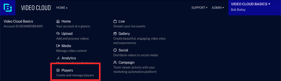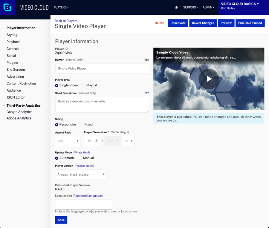 ビデオクラウドの基本: プレイヤーの作成 このトピックでは、Playersモジュールを使用してBrightcoveプレーヤーを作成する方法を学習します。 ステップ Video Cloud Studio で、[ プレーヤー ] をクリックして [ プレーヤー]モジュールを開きます。 [新規プレーヤー]をクリックします。 「名前」と「短い説明」を入力します。 [保存]をクリックします。 プレーヤーのプロパティページを表示するには、プレイヤー名をクリックします。
