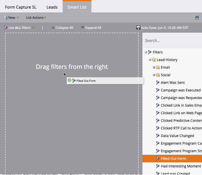 - 左側のナビゲーションで、[グループスマートリスト] を展開し、[ フォームキャプチャ SL] をクリックします。