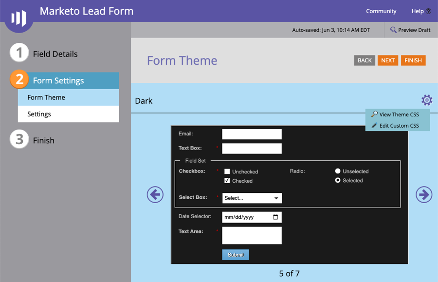 Marketo は、フォームの作成時に、フォームテーマを選択して基本的なフォームスタイルを提供する機能を提供します。独自のカスタム CSS を使用してフォームをカスタマイズすることもできます。このセクションでは、ダークテーマをカスタマイズし、ラベルのテキストを白と太字にします。Marketon フォームの詳細については、 Marketon のドキュメントを参照してください。