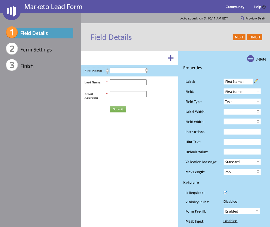 - フォームデザイナが開きます。デフォルトでは、名、姓、および電子メールアドレスのフィールドがフォームに表示されます。必要に応じて、フィールドのプロパティと動作を編集します。[ 次へ] をクリックします。