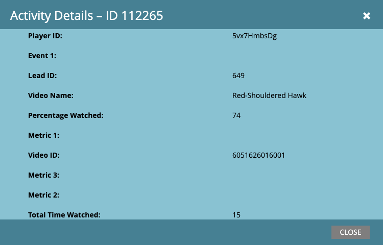 - 行をダブルクリックして、キャンペーンに入力されたフィールドを表示します。ポップアップには、プレーヤーID、ビデオID、ビデオ名、視聴率、その他のフィールドなど、キャンペーンからMarketoに配信されたビデオ視聴データが表示されます。