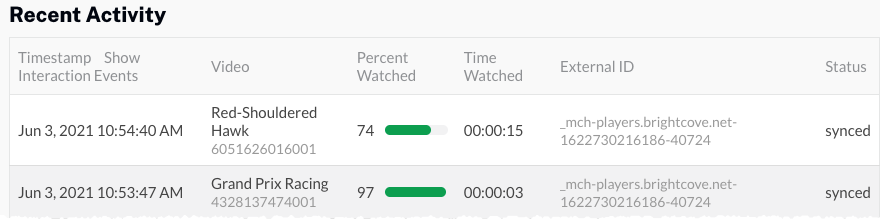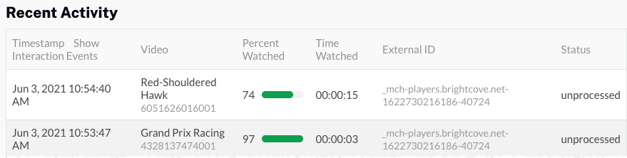 - 視聴したばかりの動画の名前を示す最近のタイムスタンプが付いたイベントがあることを確認します。イベントステータスは未処理である必要があります。これは、キャンペーンがビューをキャプチャしたが、Marketoとの同期をまだ試みていないことを示しています。