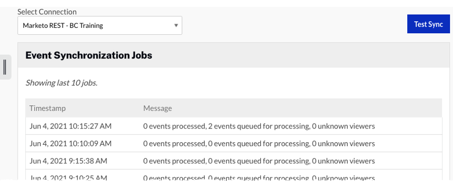 - [ 同期のテスト] をクリックして、手動同期をトリガーします。手動同期をトリガーできる頻度は制限されます。デフォルトでは、キャンペーンは1時間に1回ビューをMarketoに同期します。