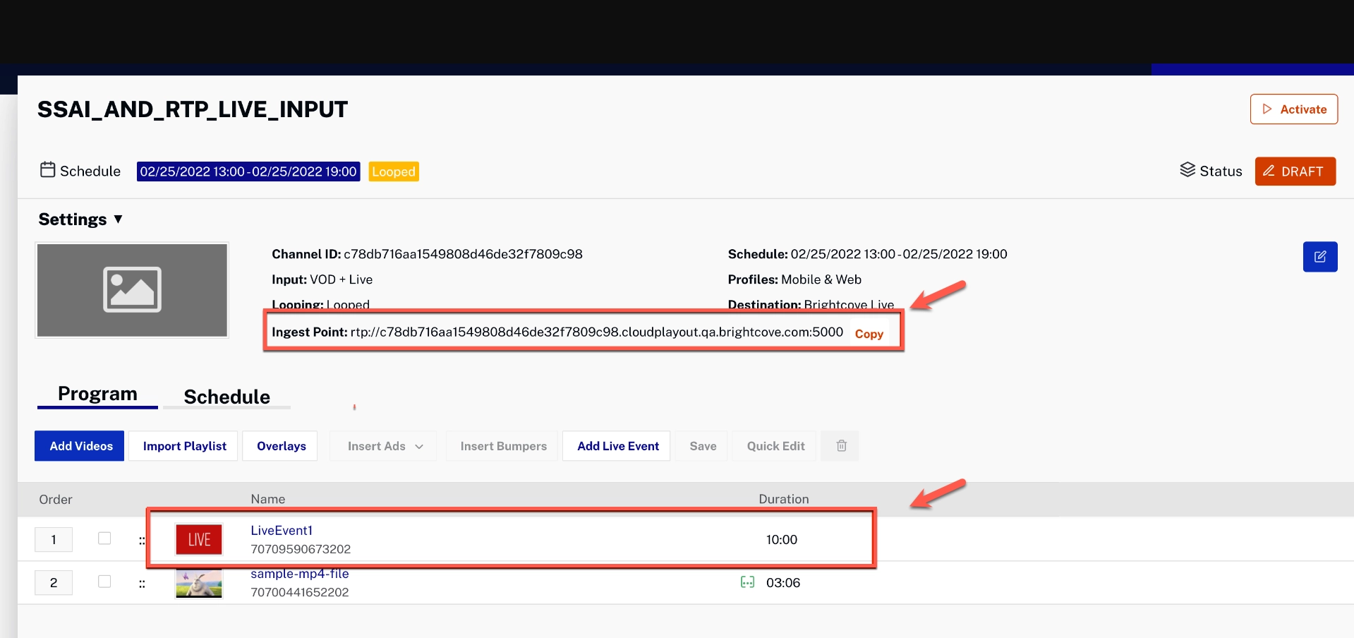 - Cloud Playout SSAIチャンネルは、入力ソースフィードとして RTP PUSH を受け入れます。