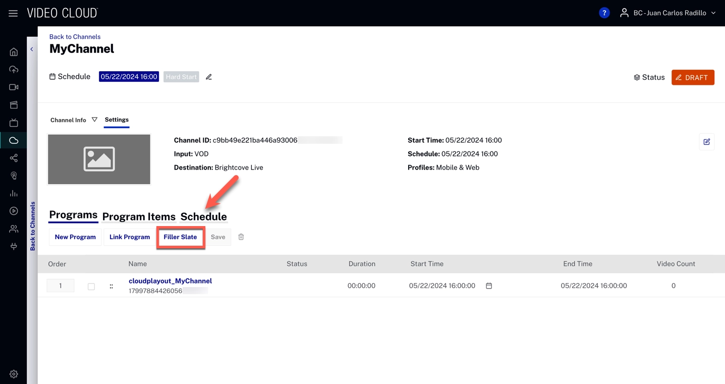Brightcove は、すべてのアカウントにデフォルトのスレートを提供します。 代わりにカスタム スレートを使用するには、恒久的な URL で MP4 動画をホストし、それをアカウントにアセットとして追加して、好きなだけ Cloud Playout チャンネルで使用できます。