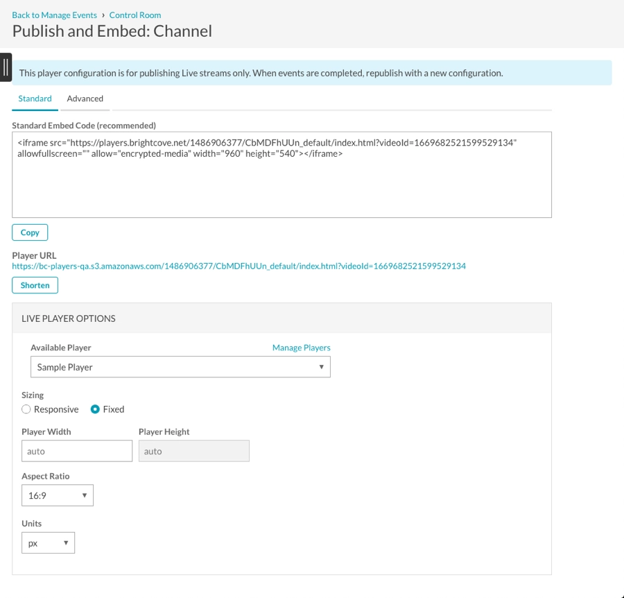 - プレーヤーURL をクリックすると、ブラウザでイベントをプレビューすることができます。または、適切な埋め込みコードをコピーして使用することができます。
