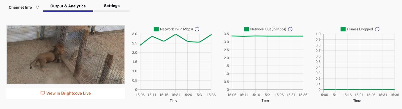 チャンネルが 稼働中(RUNNING) の状態であれば、チャンネルの出力やアナリティクス情報を確認できます。チャンネル ページで対象のチャンネルをクリックすると、チャンネルの詳細情報が表示されます。