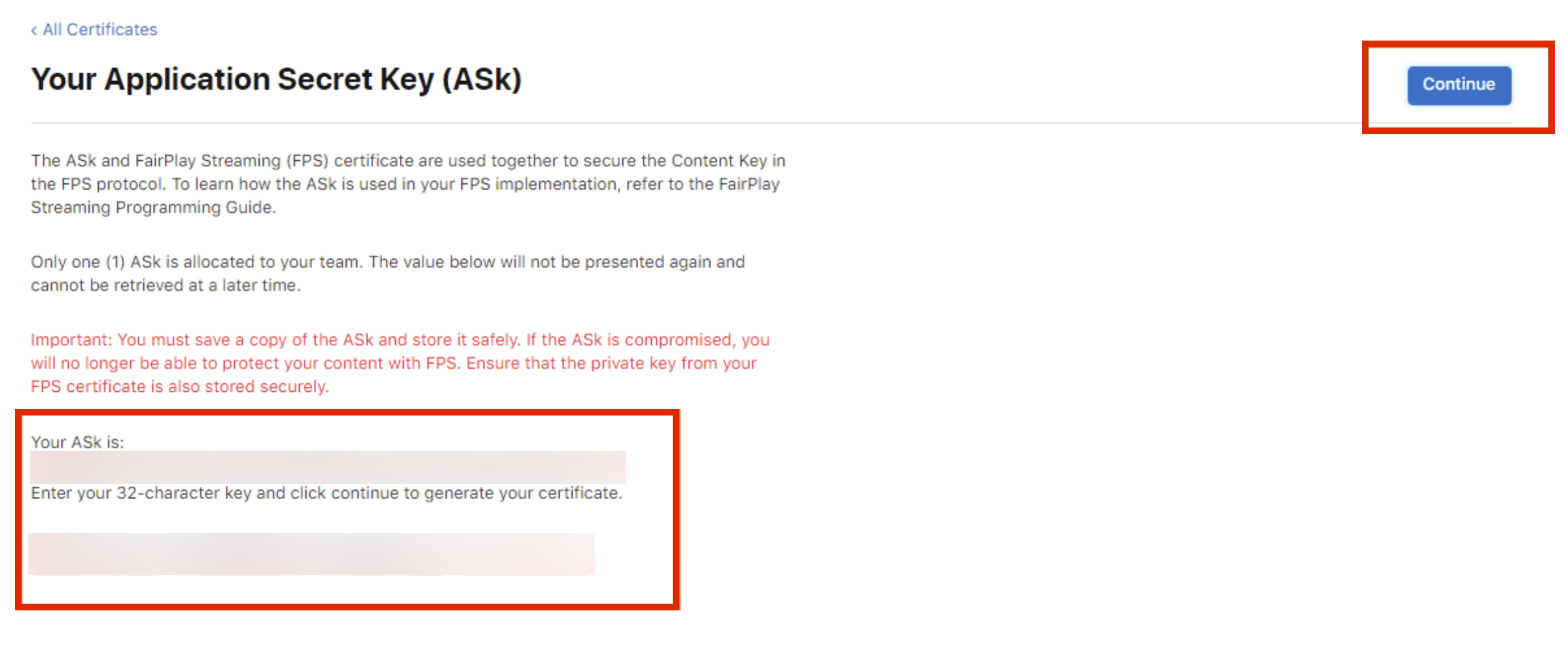 - Apple から提供された Application Secret Key をコピーし、安全に保管してください。ASK が漏洩した場合、FPS によるコンテンツ保護ができなくなります。