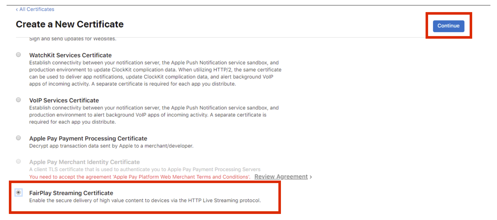 - 新規証明書の作成 セクションで、FairPlay Streaming 証明書 オプションを選択します。