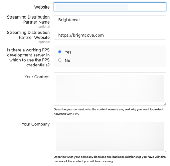 Apple の FairPlay Streaming (FPS) DRM を使用するには、Apple から FPS Deployment Package を取得し、以下の情報を Brightcove の担当者に提供する必要があります。