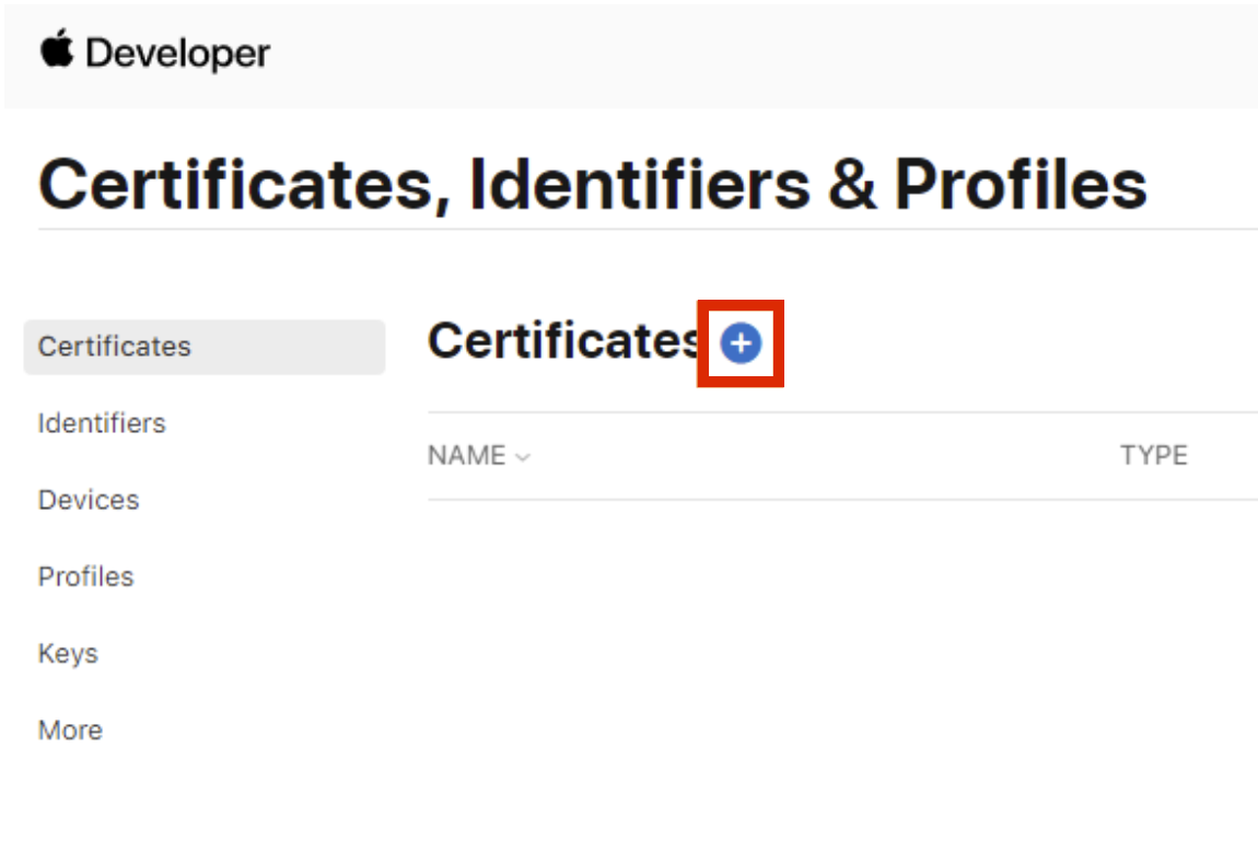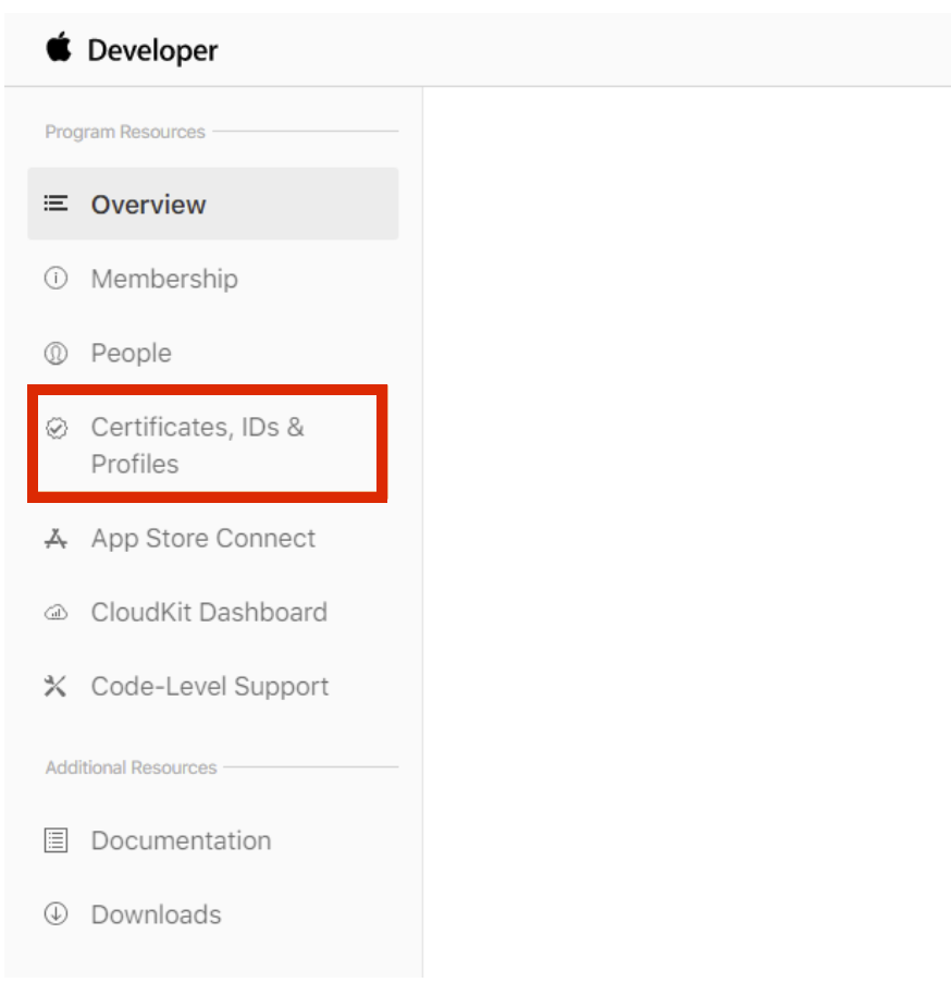 - Apple ディベロッパー ポータル にログインし、左側のメニューから 証明書, IDs & プロファイル をクリックします。