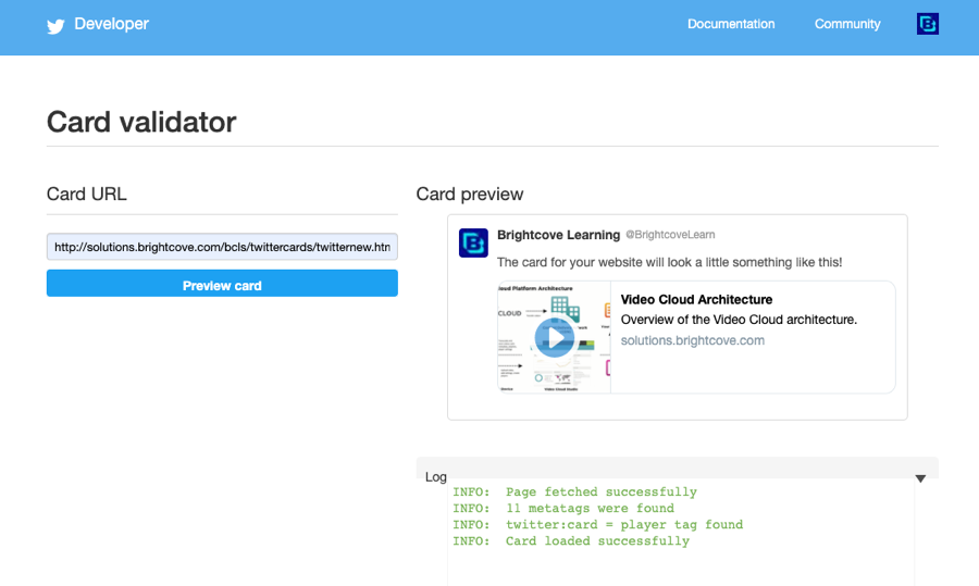 Twitterでドメインがホワイトリストに登録されていない場合、プレイヤーカードは表示されません。URLを検証すると、URLがホワイトリストに登録されていないことを示すメッセージが表示されます。承認プロセスの詳細については、 Twitter のドキュメントを参照してください。