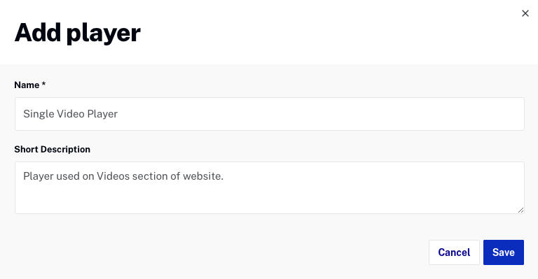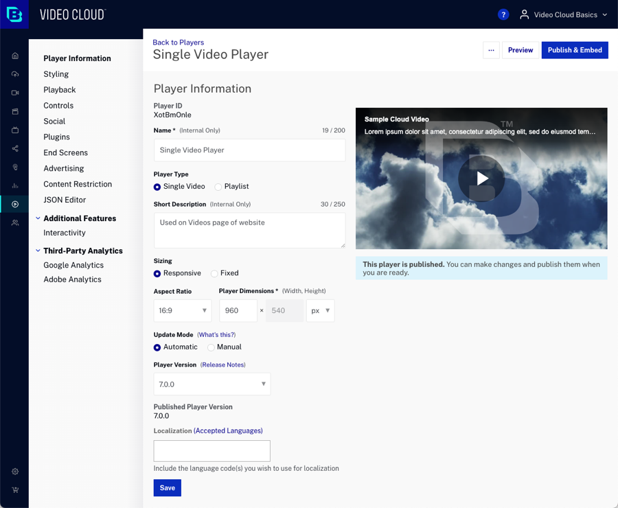 Video Cloud の基本:プレーヤーの作成 このトピックでは、Players モジュールを使用して Brightcove プレーヤーを作成する方法を学びます。 手順 メインナビゲーションで プレーヤー をクリックします。 + プレーヤーの追加 をクリックします。 名前 と 追加 を入力します。 保存 をクリックします。 プレーヤーのプロパティページを表示するには、プレーヤー名をクリックします。