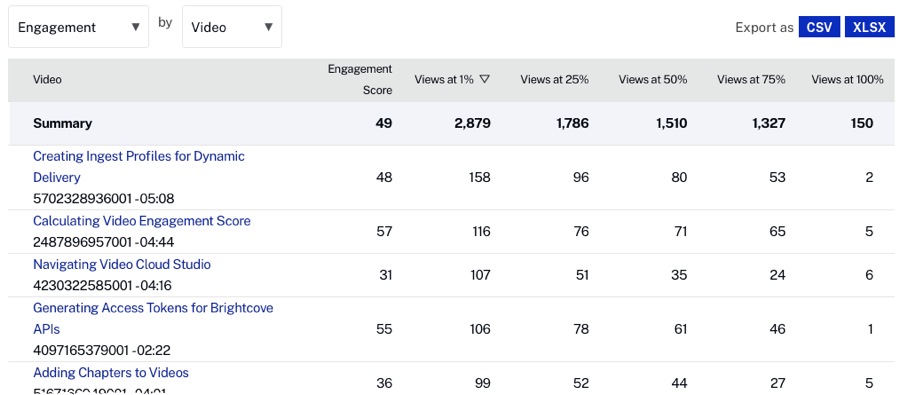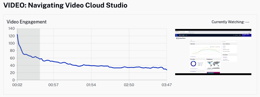 - 動画タイトルをクリックすると、その動画のエンゲージメントデータが表示されます。グラフには時間経過に沿った動画の再生回数が表示され、グラフの急な上昇は、その部分が繰り返し再生されたことを示しています。急激な視聴率の低下がある場合は調査が必要です。