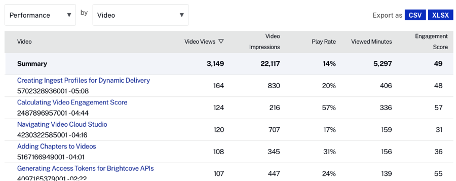 - Video Cloud Studio で、アナリティクスモジュールを開きます。パフォーマンスレポートが表示されます。
