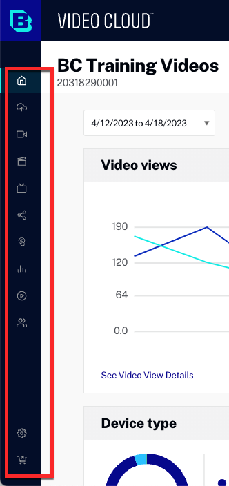 Video Cloud Studio の設定にアクセスするには、主要ナビゲーションより 管理者 アイコン をクリックします。 Video Cloud 管理者メニューから、以下の項目にアクセスできます: