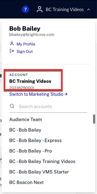 複数の Video Cloud アカウントにアクセス可能な場合、Video Cloud アカウント セレクターを使用して、アクセスする Video Cloud アカウントを選択することができます。 アカウントを切り替えるには、Video Cloud Studio の右上隅にある プロファイル アイコンをクリックします。現在アクセスしているアカウントは、アカウント リストの上に表示されます。