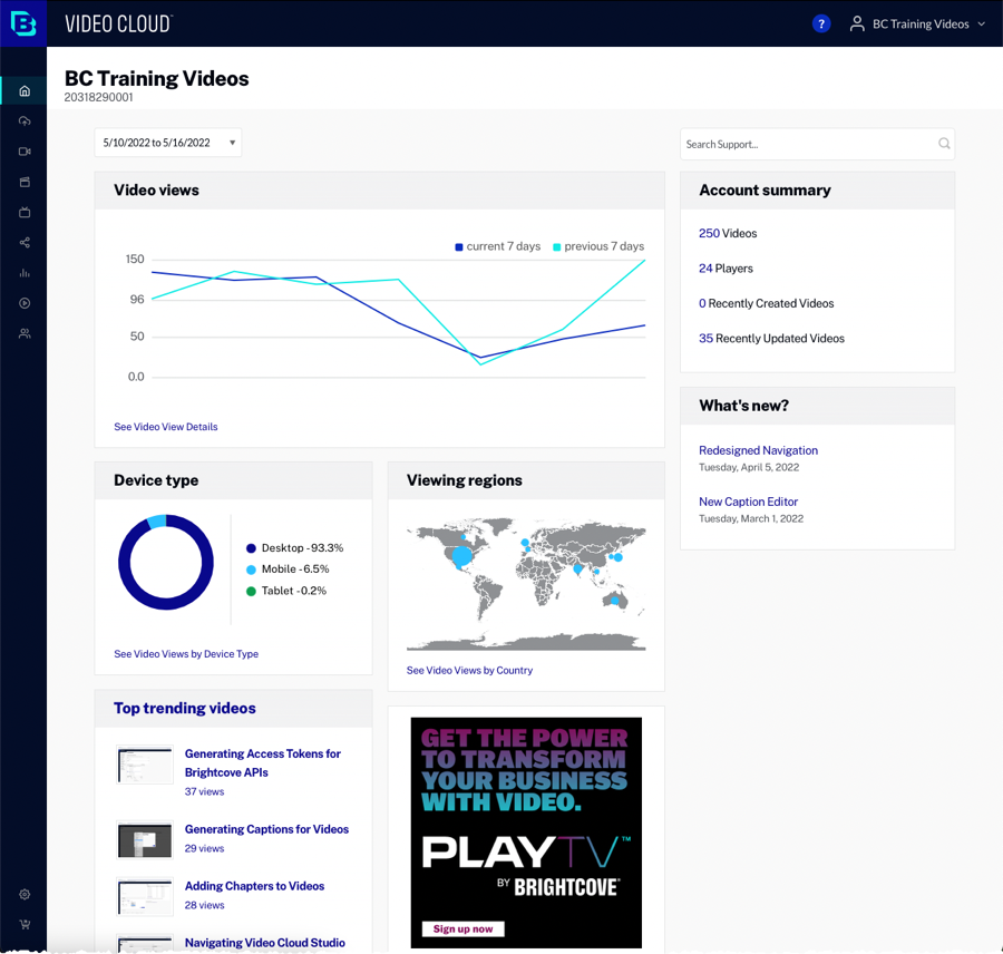 - 最新情報 - Displays Video Cloud 製品のアップデート情報が表示されます. 更新情報の一覧についてはVideo Cloud Studio リリースノートをご覧下さい。