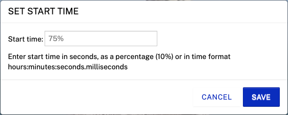 - Start time (開始時間)を秒単位、パーセンテージ、または時間形式で入力します。この例では、開始時間をビデオの75%の時点に設定しています。 (保存)をクリックします。