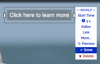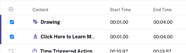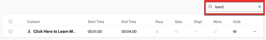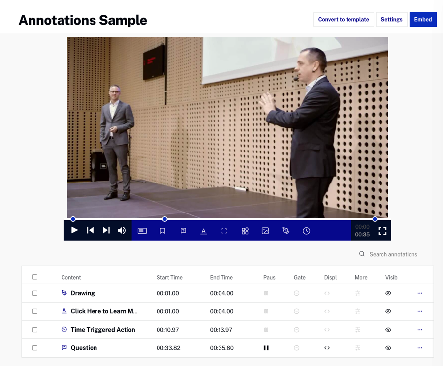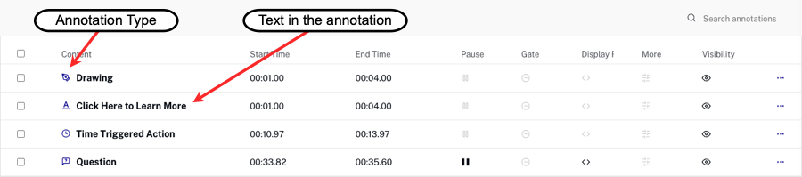 また、どの注釈に Pause、Gate、Display Rule などの 注釈 オプション が設定されているかもすぐに確認できます。More アイコンは、主に link やカスタムコードが設定されていることを示します。 アクション メニュー (...) では、注釈の編集、複製、削除ができます。Visibility アイコンをクリックすると、注釈エディタで注釈を非表示/表示できます。 可視性の設定は、注釈がビデオ内に表示されるかどうかには影響しません。