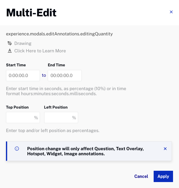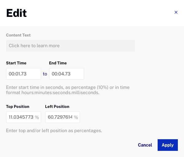 注釈名をクリックすると、そのタイムスタンプにプロジェクトがジャンプし、注釈のプロパティを編集できるクイック編集ダイアログが開きます。 注釈の種類によって、ビデオの上または左の位置を % として設定できます。