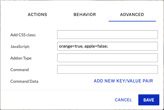 リンゴとオレンジの画像はどちらも画像オーバーレイです。どちらも表示ルールが設定されているので、それぞれの JavaScript 変数 (apple または orange) が true に設定されている場合のみ表示されます。例えば、オレンジの表示ルールは以下の通りです。
