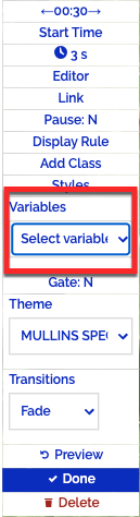 変数が定義されると、動的コンテンツを表示したり、注釈の表示/非表示に使用できる ルールを作成するために使用できます。Variables (変数)ドロップダウンから変数を選択すると、表示時に変数を解決する式がテキスト オーバーレイに追加されます。