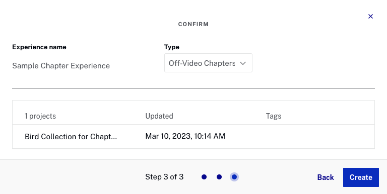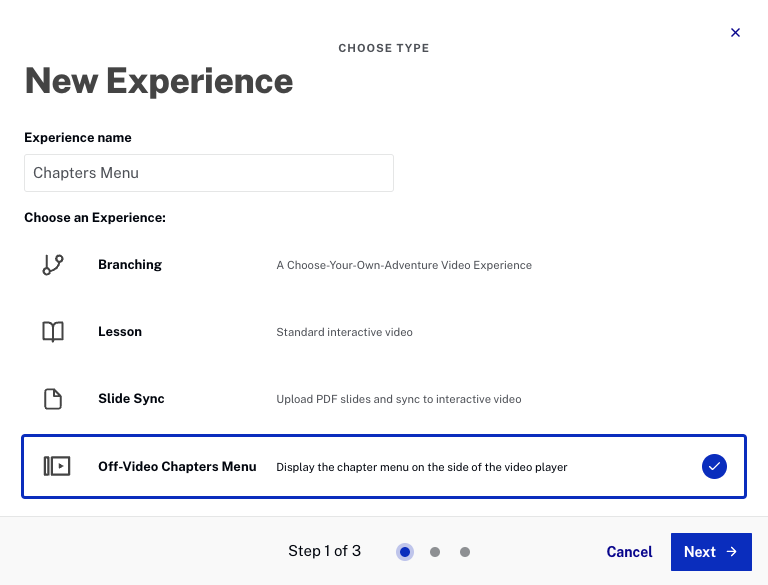 - エクスペリエンスタイプのリストから、動画外チャプターメニュー をクリックします。