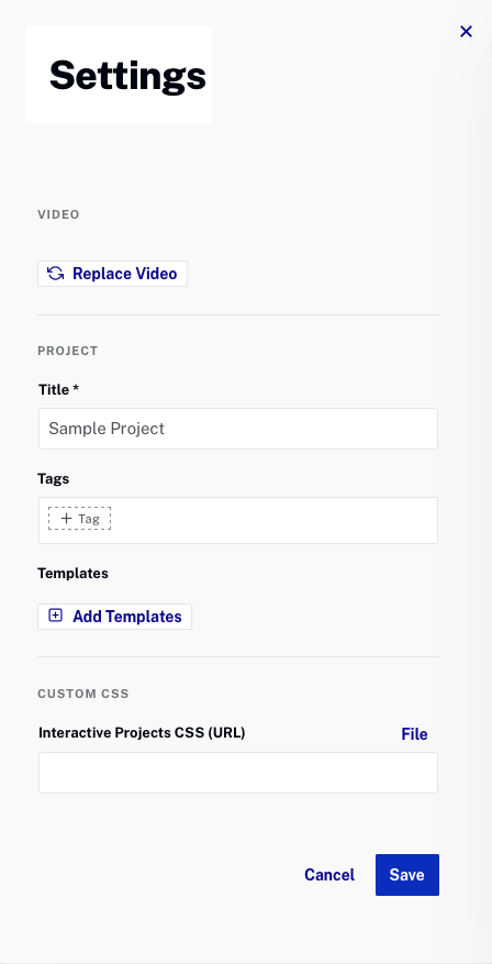 プロジェクト設定を使用して、プロジェクトのタイトルを編集したり、タグを追加したり、テンプレートを追加したり、カスタムCSSファイルを割り当てたり、プロジェクトに関連付けられた動画を置き換えたりすることができます。以下の手順に従って、プロジェクト設定を構成してください。