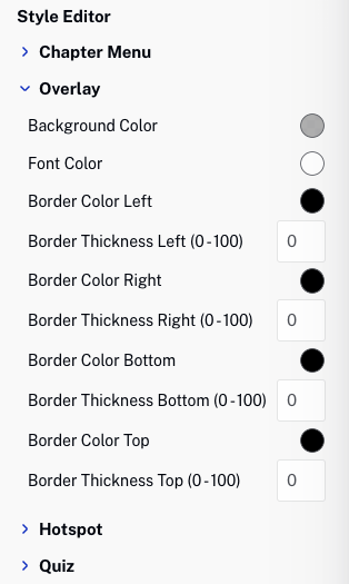 チャプターメニューのスタイルを設定するには、左のナビゲーションで オーバーレイ オプションを展開してください。以下のスタイリング オプションが利用可能です: