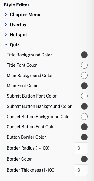 クイズのスタイルを設定するには、左のナビゲーションで クイズ オプションを展開してください。以下のスタイリング オプションが利用可能です: