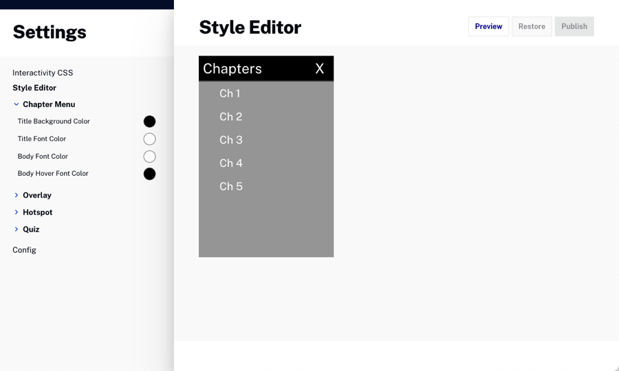 スタイルエディターを開くと、デフォルトでチャプターメニューのスタイリング オプションが表示されます。左側のナビゲーションを使用して、すべての注釈タイプのスタイリング オプションにアクセスできます。