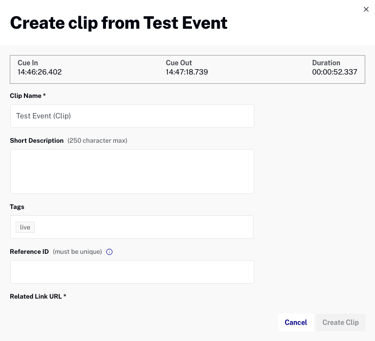 - クリップ名 とその他のメタデータを入力します。アカウントに必須項目が設定されている場合は、それらも表示され、入力が求められます。