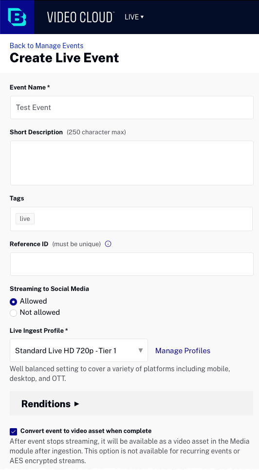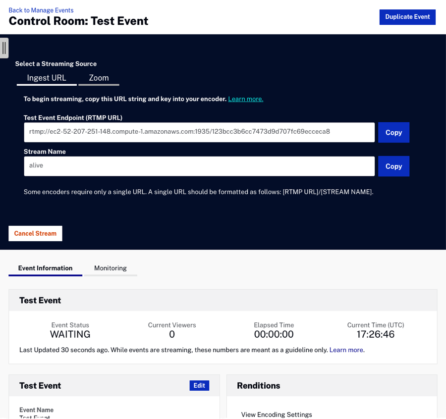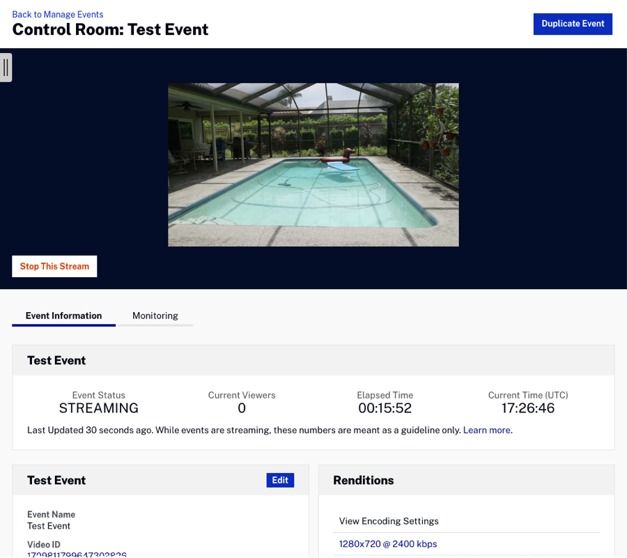 - イベントの作成 をクリックします。Live モジュールは ストリーム エンドポイント (RTMP URL) と ストリーム名 を返します。これらの値はエンコーダーの設定に使用します。